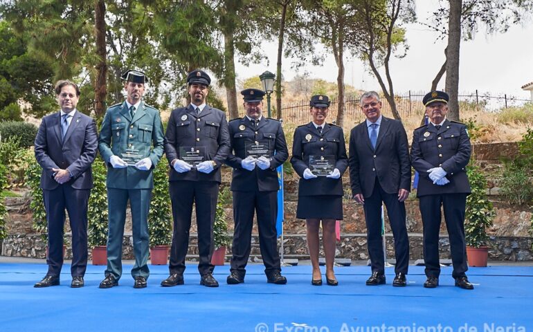 Posteriormente, el Ayuntamiento organizó un acto en los Jardines de la Cueva de Nerja, donde se rindió un merecido reconocimiento a ocho agentes de la Policía Local, un agente de la Guardia Civil y una doctora. Todos ellos habían sido previamente felicitados por el Pleno de la Corporación Municipal por sus actuaciones meritorias en el desempeño de sus funciones.